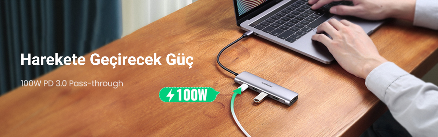 Ugreen USB-C hub, güçlü bir Power Delivery (PD) özelliğini de beraberinde sizlere sunar. Ürün üzerindeki ekstra PD girişi sayesinde cihazınızın şarj soketinin yerini kaplamadan maksimum 100W şarj için PD soketi mevcuttur. Dizüstü bilgisayarınızı hızla şarj edebilmenize imkan sağlar.
